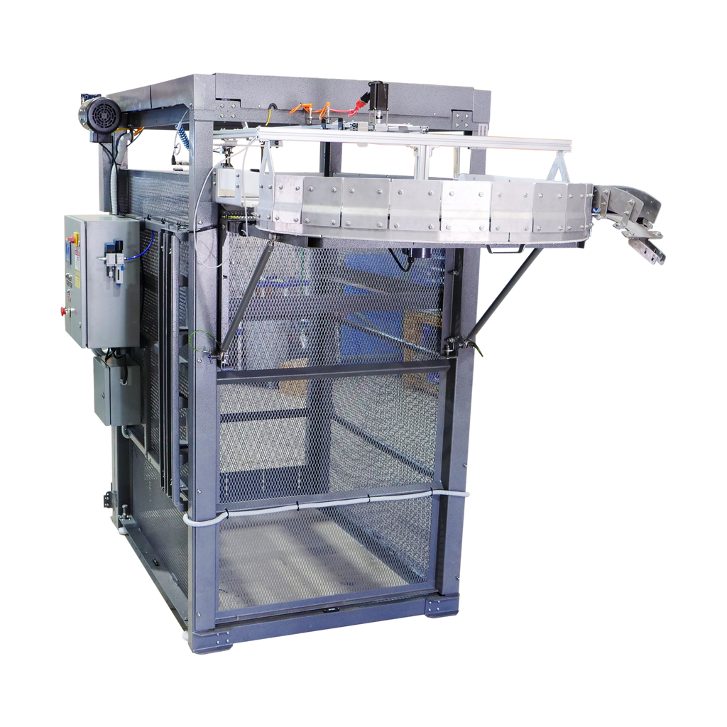 Nimbus(NMB)は、実用性と先進技術を兼ね備えたコンパクトなユニットであり、生産ニーズの変化に柔軟に対応できる設計です。 本機は自動パレットリフトとベルト駆動式スイープ機構を搭載しており、容器をロータリーテーブルまたはコンベアへスムーズに移送します。 オペレーターは操作パネルから設定を入力するだけで、簡単に制御が可能です。 使用しない時は移動・保管が容易なポータブル設計となっており、一般的なパレットジャッキで簡単に移動可能です。
